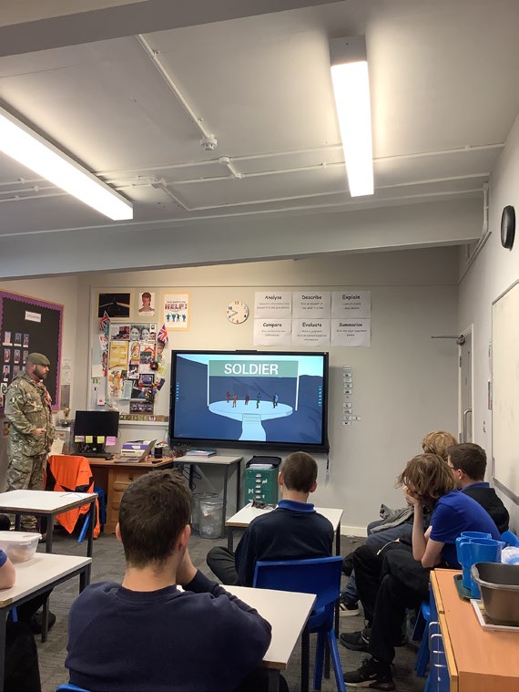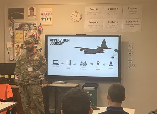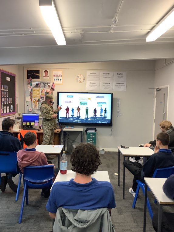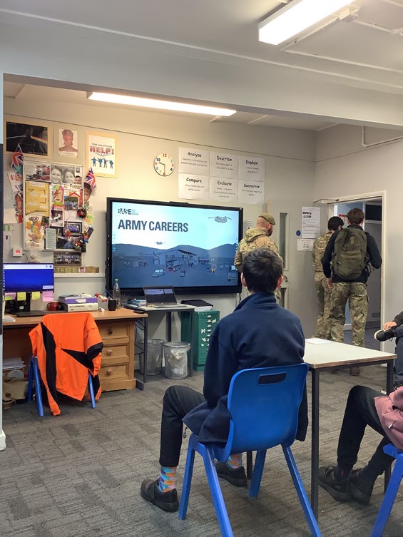 During the visit for the Army team the year 10&11 classes looked at the different jobs looked at the range of career opportunities within the British Army. Pupils engaged in this and showed great interested in a career within the army. Cpl Donaldson showed the class a presentation on a range of apprenticeship roles on offer from the Army Logistics and support, engineering, intelligence and communications, Hr and finance, medical, music and combat all specialised training for each individual to gain great skills in to succeed within the army. Clp Donaldson spoke about his own experiences within the Army, the places he had been deployed to for pursue his job, he also spoke about how much fun soldiers can have on adventure training Kenya on Safari, Spain hill walking, Canada horseback mountaineering all paid in full by the army.