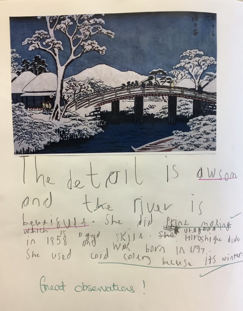 Students explored and evaluated prints by Japanese artist Utagaaw Hiroshige before having time to experiment printing with different types of tools and materials. They finished the term by designing a tree to etch into Styrofoam and complete a print themselves.