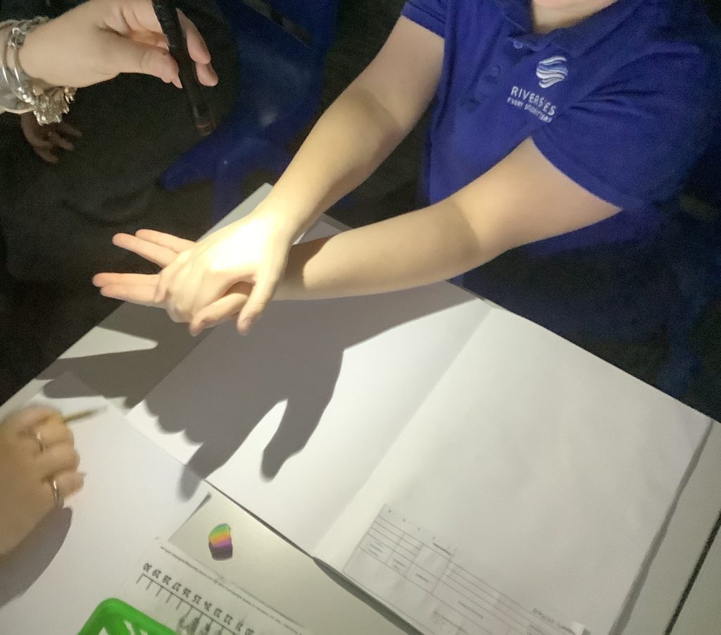 Students began by exploring shadows they could make with their hands and the shapes other objects around the room made when casting a shadow. Students drew these in their sketch books and annotated them to show what they had found.