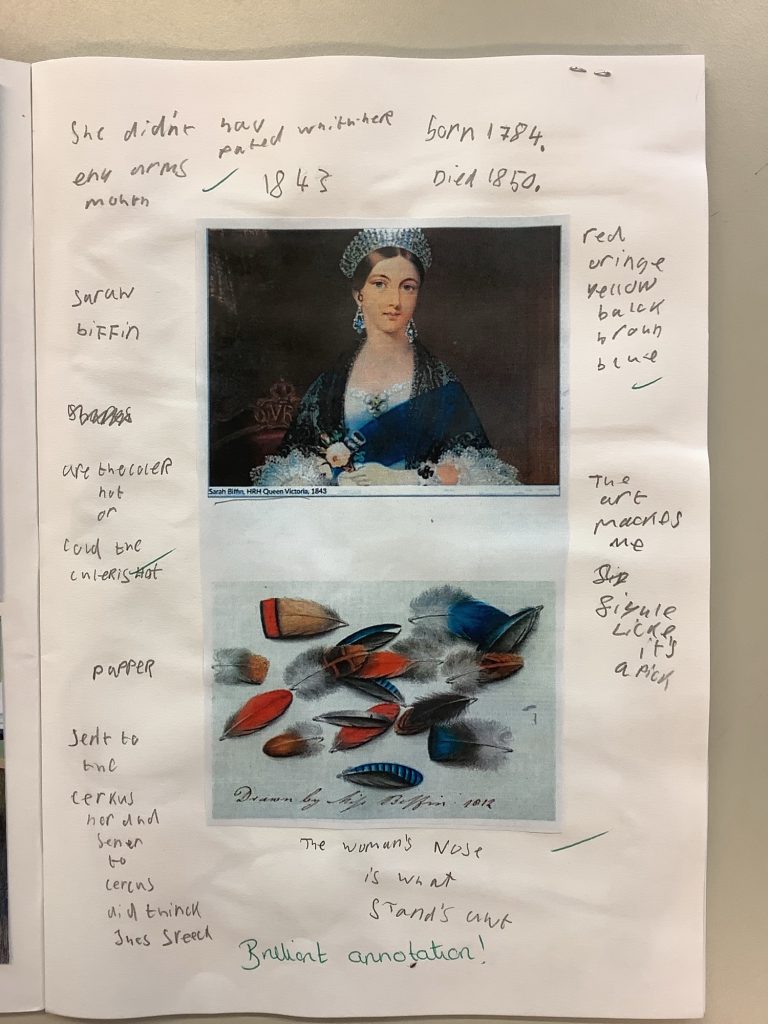 Students then move onto replicating the texture of a feather using paint – feathers appear in some of Biffin’s most famous works. Students gain an understanding of how hard it is to replicate the texture of a feather when able to use their arms, considering the fact that Biffin had to use her mouth to control the paint brush.