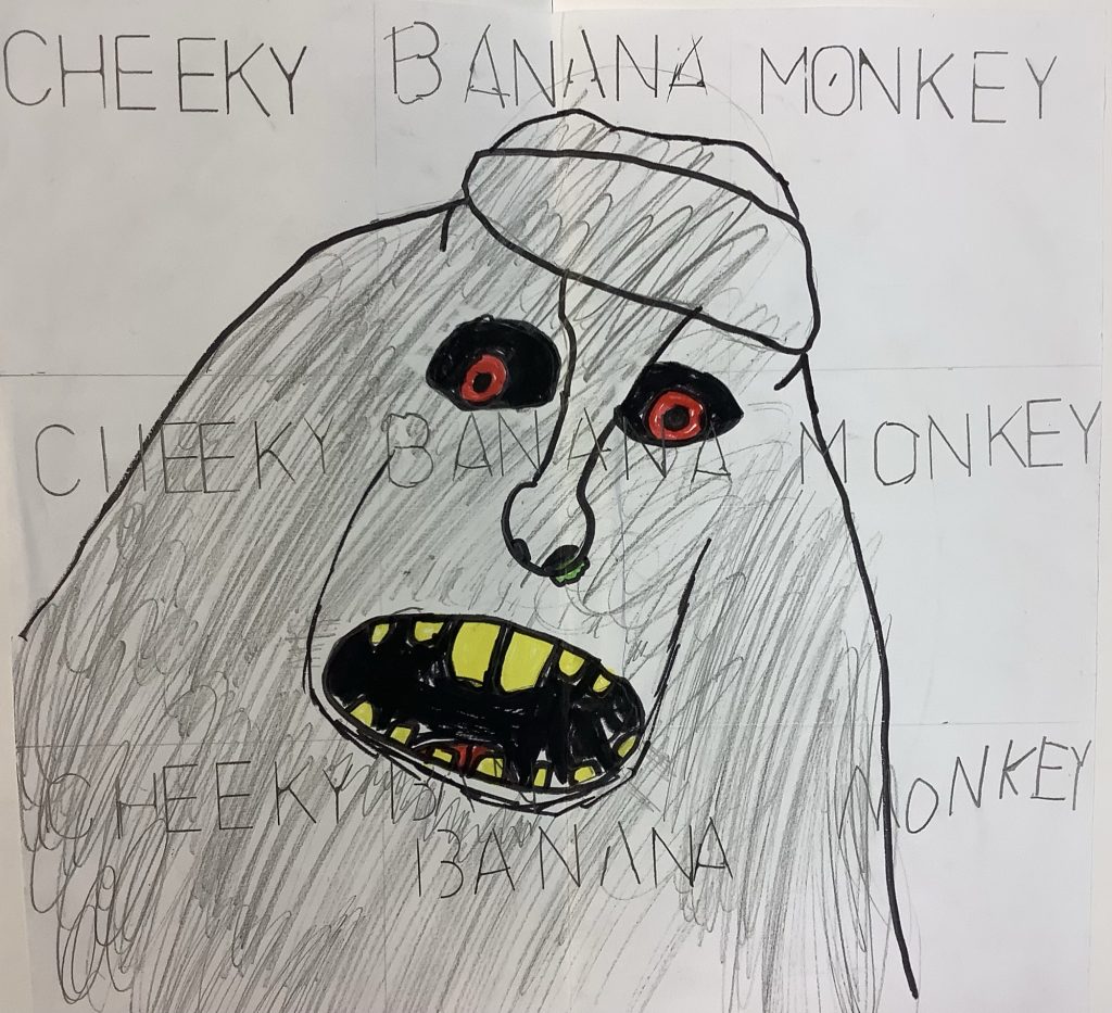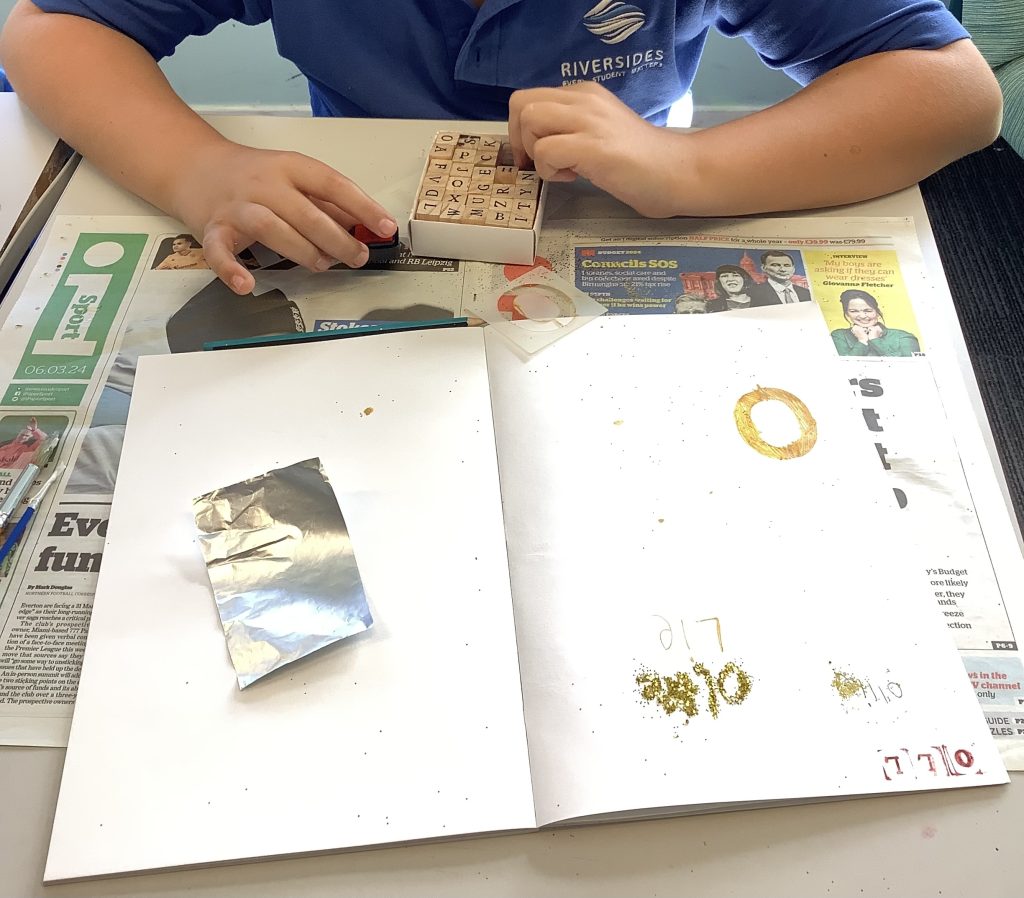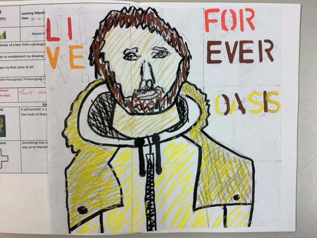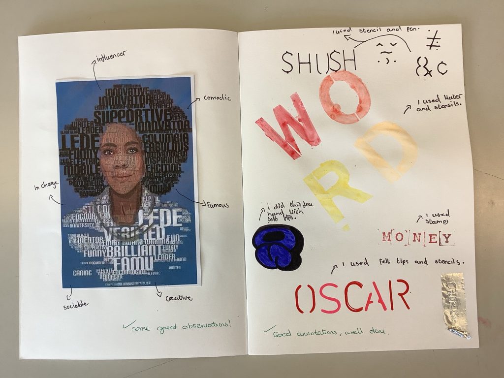 The students investigate text and how to create it from different mediums before finally spending time across multiple lessons creating a portrait broken down into squares and complemented with text.